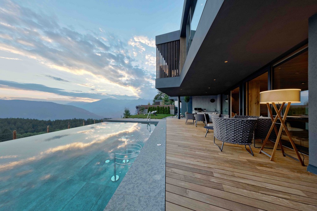 „Es gibt nichts Vergleichbares zu den exklusiven Bergvillen in der Umgebung“, so Reiterer. Und der Luxus zeigt sich vor allem im Kleinen: wunderbar bequeme Kingsize-Betten, dazu geschickte Lösungen, um auch im Winter die Skiutensilien aus dem Weg zu räumen. Eine erstklassig eingerichtete Küche vom spezialisierten Maßtischler und eine BBQ-Station auf der eigenen Terrasse. Lampen von Occhio, Flos und Foscarini. Möbel aus dem Hause Minotti. Das Highlight aber: Jede Villa hat ihren privaten Infinity Pool, in dem man eingebettet in die Berglandschaft seine Bahnen ziehen oder sich in den Whirl-Attraktionen entspannen kann. Die eigene Panorama Outdoor Sauna „black Design“ mit Infrarottechnik gehört ebenfalls zur exklusiven Ausstattung.