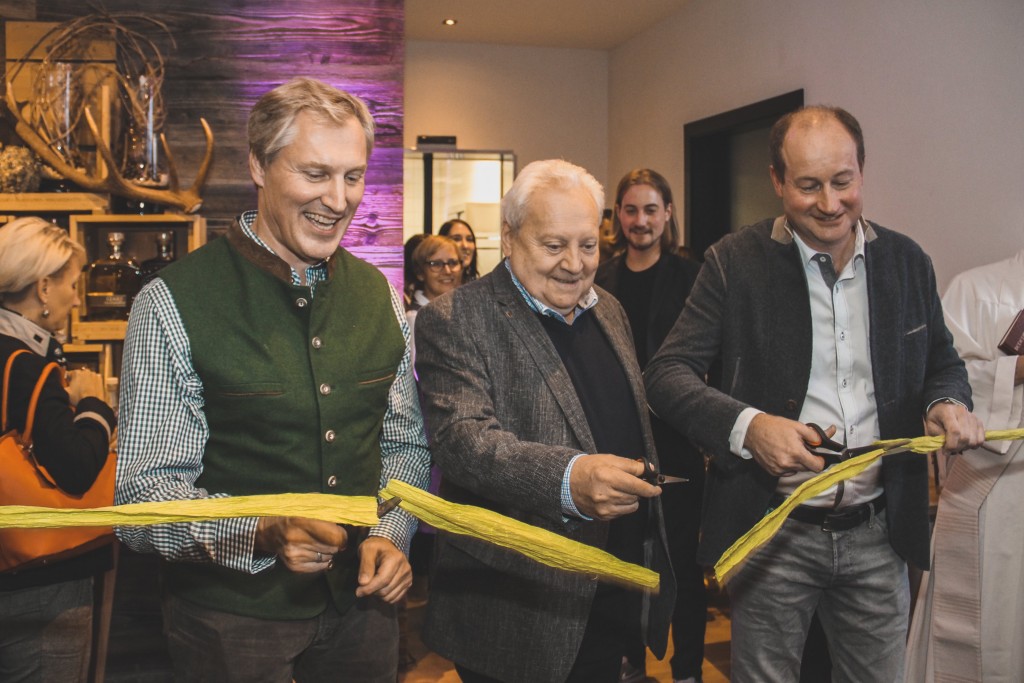 Bildlegende (v.l.n.r.): Dr. Jörg Haas, Investor und Geschäftsführer BonnVisio-Gruppe, Anton Mallaun, Bürgermeister von See und Architekt und Betreiber Thomas Schönauer eröffnen feierlich das Stadldorf Bergwiesenglück.
