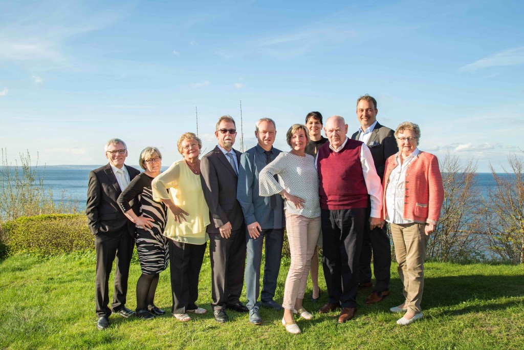Bildunterschrift (v.l.n.r.) Langjährige Mitarbeiter des Hotel Bernstein werden im Rahmen der Jubiläumswoche von Thomas und Sandra Dorissen geehrt: Detlef und Marina Nützmann (25 Jahre), Uschi Grieger (mittlerweile Rentnerin, aber von Anbeginn im Hotel Bernstein Angestellte), Frank Hühr (16 Jahre), Uwe Schediwie (23 Jahre), Trixi Michel (25 Jahre), Sandra und Thomas Dorissen sowie Bauherr Paul Rempe mit Partnerin.